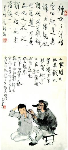 李可染的人物画《白毛女》,卷轴上方是刘勃舒的鉴赏墨宝