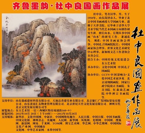 2012年10月20日上午,“齐鲁墨韵•杜中良国画作品展”在北京东方艺术馆隆重开幕,原周总理秘书、中国第一任礼宾官员、周恩来纪念馆馆长、著名书画家古今明,中国传统文化促进会会长杨丽丽,解放军艺术学院政委谭友鹏,央视《寻宝》鉴定专家、林散之大师弟子、书法名家王敬之,中国书协会员、中国将军诗书画院副院长李建国将军,东方艺术馆馆长、凌翔阁画院院长张永祥,中国书画家练联谊会玉泉书画院院长程志强,中国传统文化研究会执行会长那国宏,国家安全局安全监察司司长杨庆生,中国传统文化促进会名誉会长詹国太,北京书画研究会秘书长、著名书法家刘京生等嘉宾,以及企业家、艺术家百余人参加了开幕式。