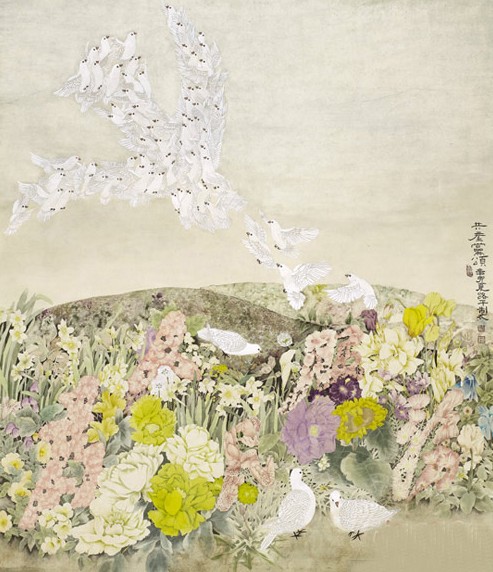 该画作传承了中国画多焦点和散点透视的技法,描绘了漫山遍野的鲜花、蓝天和绿野。在地面,三只和平鸽组成幸福的一家;在天上,另一组鸽子排出镰刀斧头的党徽形象;在山坡上,红色的花朵组成“为人民服务”的字样。