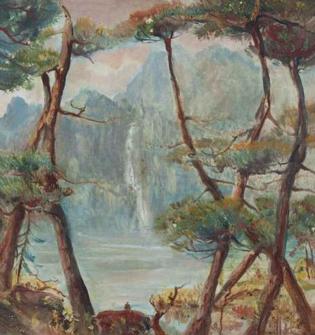 李铁夫作品整体数量稀少,且传世作品大部分藏于在广州美术学院而鲜少露面。画家在民间流传且有可靠发表的风景仅有两幅,这幅《遥望瀑布》即为其中之一,极为珍贵。此画中远景为崇山峻岭起伏连绵,近景为古松奇崛挺拔,奔放的笔触和大胆的造型相得益彰,表现出一种略带抒情的宁静古远气氛。实属难得之精品。与李铁夫同为广州籍的另一位在中国现代美术史上产生重要影响的早期油画先驱冯钢百,此次亦有60年代力作《铁树花》现身。