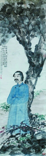 时年42岁的傅抱石先生是山水画大家,也擅长古装人物画,但其现代人物写真并不多见。而他赠予的《敬此为寿》中,画的是陈氏全身像,十分难得。画长136厘米、宽40厘米。纸为夹宣。画的中央部分为身着长衫、布履的陈氏,站在一株挺立的青松之前,一棵红梅,在乱石堆中拔地而起,掩于陈氏膝下;一组翠竹发端于梅丛,又从松下右侧穿过,至左侧直绕至右侧,由近至远,消失于画外,使松、竹、梅成为有机联系的一组,烘托着陈氏的立像。松、竹、梅是中国文人极为喜爱的“岁寒三友”,都具有不畏严寒的铮铮铁骨,也是陈氏花鸟画中最爱采用的题材。陈氏曾在自己的一幅画上题辞:“苍老劲拔是松之格,劲节萧疏是竹之格,闲淡孤高是梅之格。”这松、竹、梅拟人化的品格,也是陈氏天生的秉性和人格之所在,以此作为其画像的衬景,极为恰切,含意深邃。